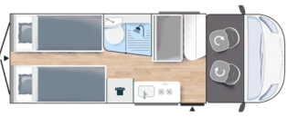 Élvezze a tökéletes társat 2 fő részére a Challenger V217-gyel! A lakóautó két nagyméretű egyszemélyes ágyat kínál, amelyeken otthon érezheti magát.